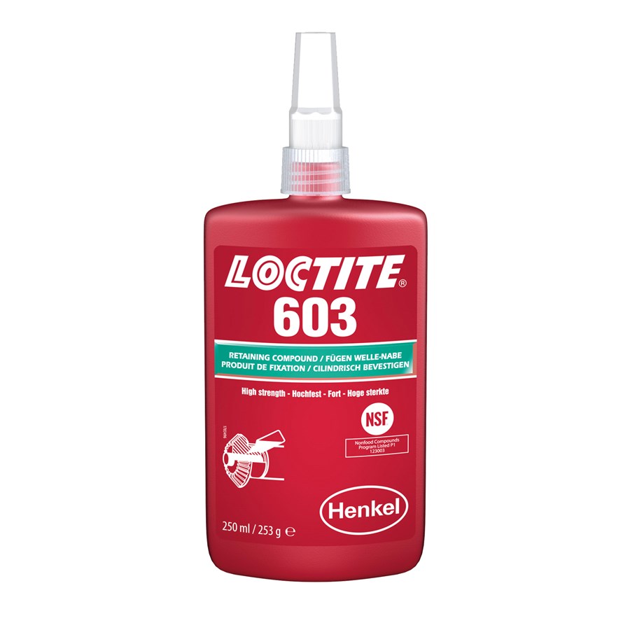 LOCTITE 603 je upevňovač s vysokou pevnosťou, vytvorený na lepenie lisovaných valcových dielov, najmä pre lisované ložiská a tiež tam, kde nie je možné zaistiť trvalo čisté povrchy. Produkt vytvrdzuje za neprítomnosti vzduchu medzi lisovanými kovovými plochami a zabraňuje uvoľneniu či priesaku v dôsledku rázov a vibrácií. Má vysokú toleranciu voči oleju.